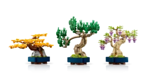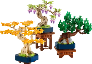 • Boomdecoratie – de bouwset bevat een ginkgo bonsaiboompje met gele bladeren, een zwarte den bonsaiboompje met groene naalden en een blauweregen bonsaiboompje met hangende lila bloemen