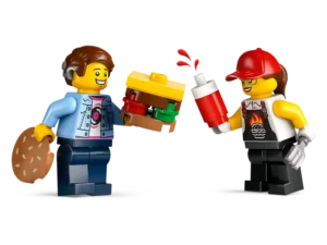 - Wat zit er in deze voertuigbouwset? – alles wat kinderen nodig hebben om een hamburgertruck en minifiguren van een verkoper en een klant met een gehoorimplantaat te bouwen, plus LEGO® sausflessen