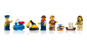 - Wat zit er in de doos – deze LEGO® treinset bevat een locomotief, kolentender, platte wagon, passagierswagon, perron, een 16-delige ronde baan, miniatuurspeelgoed waaronder een 3D-geprint treinstuk en 4 minifiguren