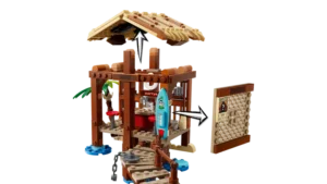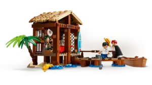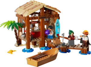 Kinderen kunnen het dak van de strandwinkel verwijderen om toegang te krijgen tot de binnenkant. Hier vinden ze accessoires voor de winkel en leuke klanten. Er is een ‘Wanted’-poster om aan de muur te bevestigen en ruimte voor extra ‘Wanted’-posters uit andere LEGO® ONE PIECE sets (apart verkrijgbaar). Buiten is een piratenboot met een ketting aan de steiger bevestigd. De set bevat minifiguren van Luffy, Shanks en Makino, 3 bekende personages uit de Netflix serie. Voor extra digitaal plezier kunnen bouwers inzoomen, modellen in 3D draaien en hun voortgang bijhouden met behulp van de intuïtieve LEGO Builder app. De set bevat 299 onderdelen.