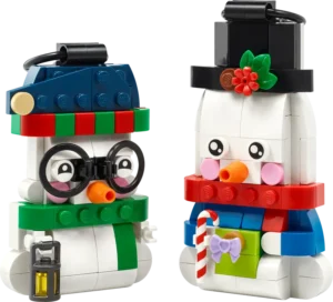 Meisjes en jongens zullen veel plezier beleven aan het bouwen van de sneeuwpoppen en het bekijken van alle schattige details, waaronder hun lieve wortelneuzen. Er is een volwassen sneeuwpop met een hoge hoed en een cadeau en een kindersneeuwpop die een bril en een muts draagt en een lantaarn vasthoudt. De sneeuwpopfiguren hebben ophangringen, zodat ze na het bouwen als LEGO kerstversiering in de boom kunnen hangen. Je kunt ze natuurlijk ook in de vensterbank zetten, zodat iedereen ze kan zien.