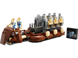 Creëer een Handelsfederatie troepentransport (40686) ter gelegenheid van het 25-jarig jubileum van Star Wars: The Phantom Menace en de LEGO® Star Wars™ sets. Dit bouwbare Star Wars voertuig voor volwassenen heeft ruimte voor 2 Pilot Battle Droid LEGO figuren en 6 Battle Droids die op het bagagerek passen, klaar voor de Slag om Naboo. Het rek schuift uit en kan worden opengevouwen, net als in Star Wars: The Phantom Menace, en biedt plaats aan de blasters van de Battle Droids. Een LEGO Star Wars steen ter ere van het 25-jarig jubileum maakt deze blikvanger compleet.