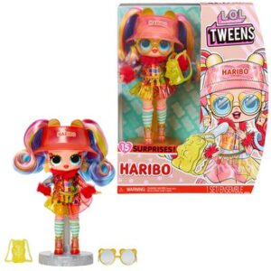 Maak kennis met de limited edition L.O.L. Surprise Tweens Haribo-modepop Holly Happy, de grote zus van de minipop Rosy Bear! Pak 15 verrassingen uit en bewonder de vrolijke en brutale mode met snoepthema van Holly Happy! Holly Happy is grappig, aardig en dol op dansen. Iedereen vindt haar altijd superleuk, omdat ze net zo zoet is als het snoep waar ze van houdt! Haar mode en accessoires zijn geïnspireerd op de goudberen van Haribo met een vrolijke, snoepkleurige rok, jack afgezet met nepbont over een bodysuit met goudberen-print, gestreepte kniekousen en accessoires, zoals een gele goudberen-boekentas, een kettingriem met lief klein goudbeertje eraan, roze en gele sneakers met sleehak, schattige zonnebril in de vorm van een beer, een nostalgische roze bucket hat met oren en de schattigste goudberen-oorbellen die je ooit hebt gezien! Haar look is sprankelend en vrolijk met lange, regenboogkleurige staartjes en snoepkleurige mode en make-up. Geschikt vanaf 4 jaar.