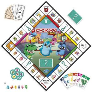Met 2 spellen in 1 is dit Monopoly Junior-spel het spel voor kleine handelaars dat met je kind meegroeit! Het dubbelzijdige spelbord biedt 2 spelniveaus, zodat het gezin kan bepalen welk niveau het meest geschikt is. Het niveau 1-spel, aanbevolen voor kinderen van 4-5 jaar, helpt kinderen oefenen met vergelijken en tellen: ze tellen vakjes, vergelijken plaatjes en kopen bezittingen. De speler met de meeste bezittingen wint! Klaar voor een hoger niveau? Draai het bord dan om voor het uitdagender niveau 2-spel, aanbevolen voor kinderen vanaf 6 jaar, dat gericht is op lezen en simpel rekenen. Spelers komen op kindvriendelijke vakjes terecht, kopen bezittingen, ontvangen huur en ontdekken hun fortuin! De speler met het meeste geld is de winnaar. Elk niveau heeft zijn eigen set Monopolygeld en -kaarten en zijn eigen spelregels. Beide spellen hebben 6 schattige pionnen: Pinguïn, Auto, Eendje, Dwarrel, Mollie en kleine T-Rex.